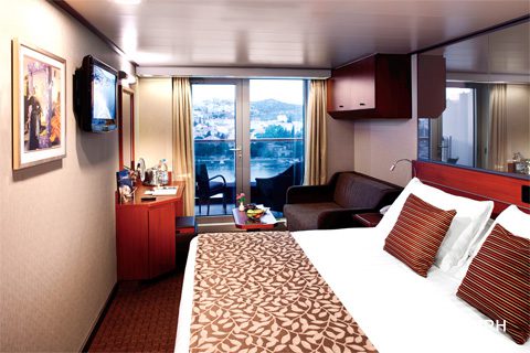 Verandah staterooms feature floor-to-ceiling glass windows with a door that opens to a private balcony, two lower beds that convert to a queen-sized bed, sitting area, and private bathroom with tub/shower combination. All staterooms include bathrobes, Elemis bath amenities, complimentary fresh fruit, flat-panel TV and DVD player, personal safe, telephone, and hair dryer.