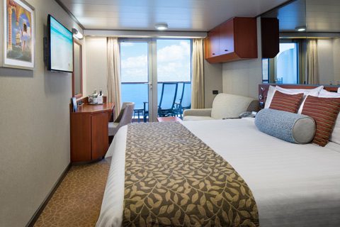 Verandah staterooms feature floor-to-ceiling glass windows with a door that opens to a private balcony, two lower beds that convert to a queen-sized bed, sitting area, and private bathroom with tub/shower combination. All staterooms include bathrobes, Elemis bath amenities, complimentary fresh fruit, flat-panel TV and DVD player, personal safe, telephone, and hair dryer.